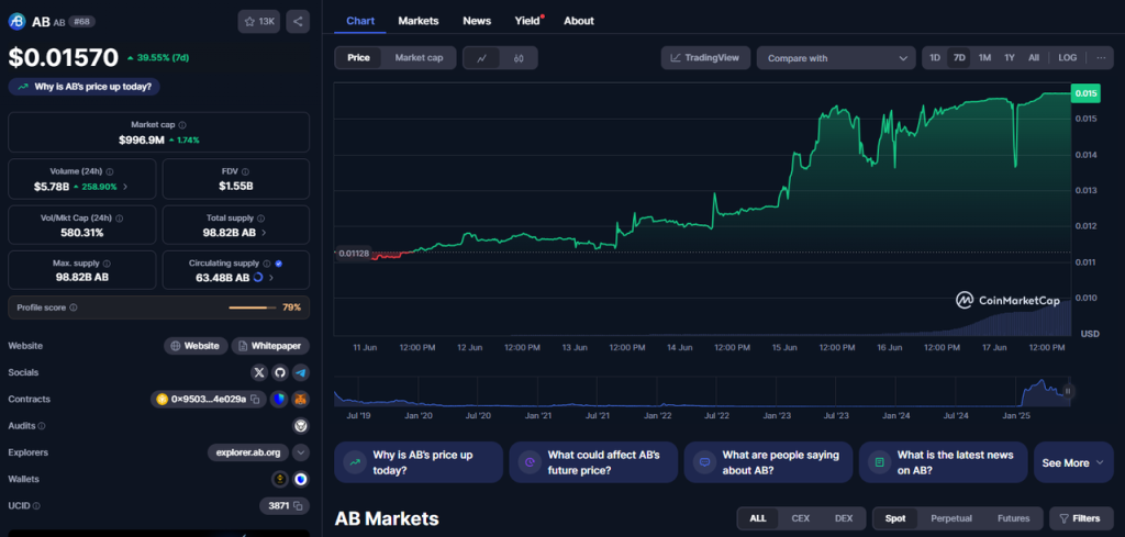 截至 2025 年 6 月 17 日,AB 價格 $0.0157、持有人 20872、市值 $9.7 億、24H 交易額 $32.79 億、24H 交易筆數 228.7萬