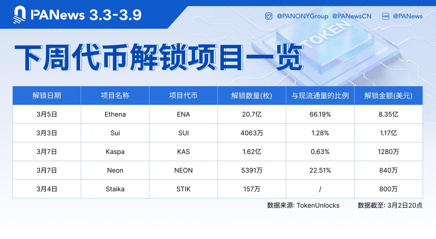 WEEX 唯客博客, PANews 3月2日消息,Token Unlocks數據顯示,ENA、SUI、BERA等代幣將於下周迎來大額解鎖,其中: Ethena(ENA)將於北京時間3月5日下午3點解鎖約20.7億枚代幣,與現流通量的比例為66.19%,價值約8.35億美元; Sui(SUI)將於北京時間3月3日上午8點解鎖約4,063萬枚代幣,與現流通量的比例為1.28%,價值約1.17億美元; Kaspa(KAS)將於北京時間3月7日上午8點解鎖約1.62億枚代幣,與現流通量的比例為0.63%,價值約1,280萬美元; Neon(NEON)將於北京時間3月7日上午8點解鎖約5,391萬枚代幣,與現流通量的比例為22.51%,價值約840萬美元; Staika(STIK)將於北京時間3月4日上午8點解鎖約157萬枚代幣,價值約800萬美元。 WEEX交易所官網:https://www.weex.com