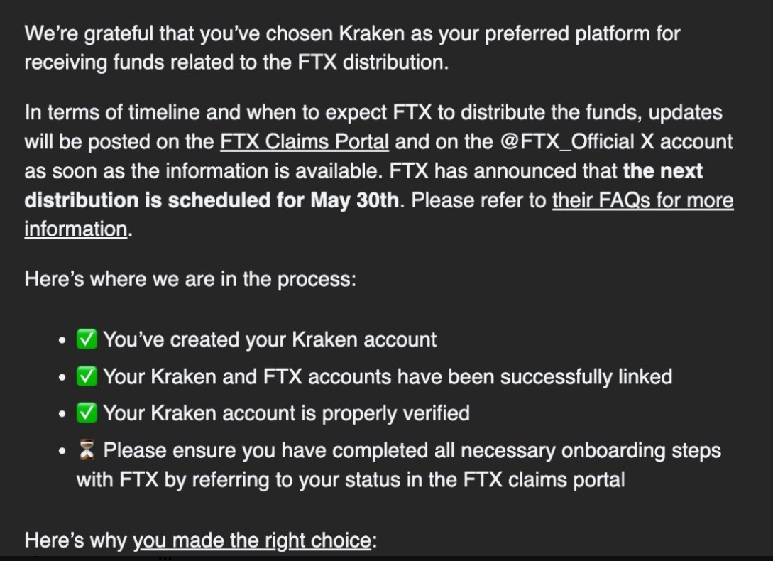 WEEX 唯客博客, PANews 3月6日訊息,根據FTX債權人代表Sunil訊息,Kraken已開始向FTX客戶發送確認郵件,宣布下一輪FTX賠償分配將於2025年5月30日進行。 先前消息, FTX下一輪還款分配將於5月30日開始。 WEEX交易所官網:https://www.weex.com