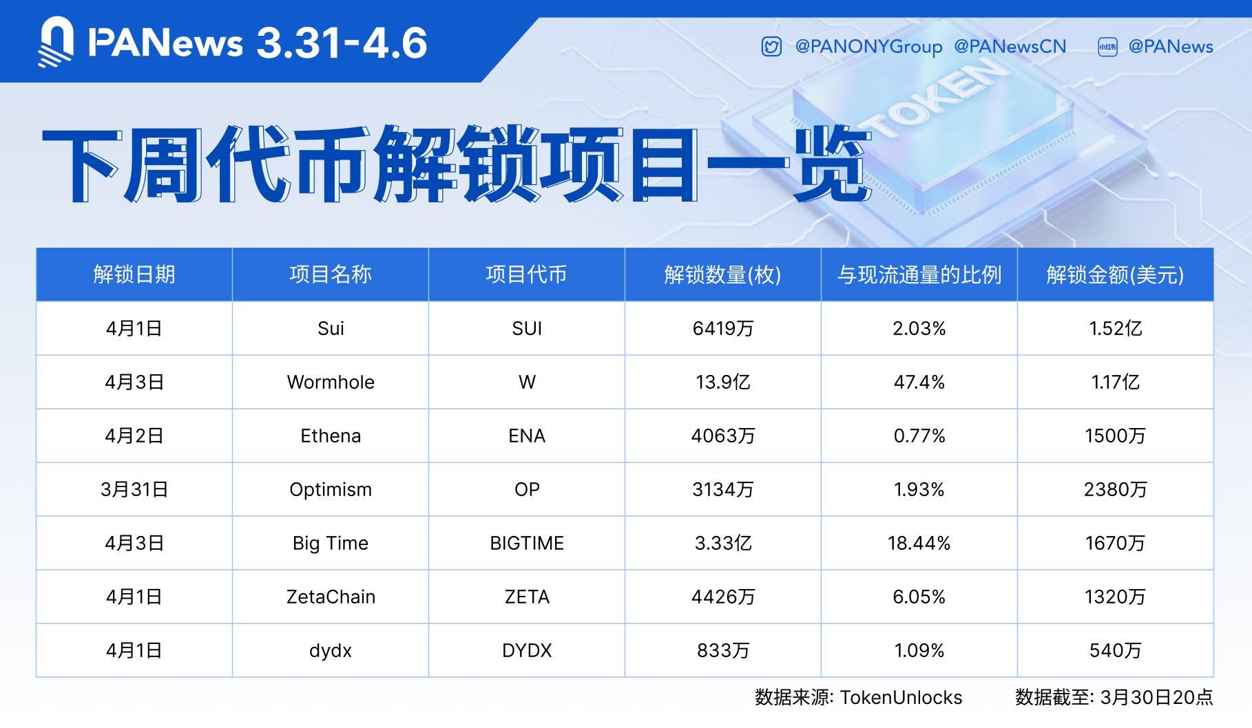 WEEX 唯客博客, PANews 3月30日消息,Token Unlocks數據顯示,SUI、W、ENA等代幣將於下周迎來大額解鎖,其中: Sui(SUI)將於北京時間4月1日上午8點解鎖約6,419萬枚代幣,與現流通量的比例為2.03%,價值約1.52億美元; Wormhole(W)將於北京時間4月3日晚上7點30分解鎖約13.9億枚代幣,與現流通量的比例為47.4%,價值約1.17億美元; Ethena(ENA)將於北京時間4月2日下午3點解鎖約4,063萬枚代幣,與現流通量的比例為0.77%,價值約1,500萬美元; Optimism(OP)將於北京時間3月31日上午8點解鎖約3,134萬枚代幣,與現流通量的比例為1.93%,價值約2,380萬美元; Big Time(BIGTIME)將於北京時間4月3日上午8點解鎖約3.33億枚代幣,與現流通量的比例為18.44%,價值約1,670萬美元; ZetaChain(ZETA)將於北京時間4月1日上午8點解鎖約4,426萬枚代幣,與現流通量的比例為6.05%,價值約1,320萬美元; dydx(DYDX)將於北京時間4月1日上午8點解鎖約833萬枚代幣,與現流通量的比例為1.09%,價值約540萬美元。 WEEX交易所官網:https://www.weex.com