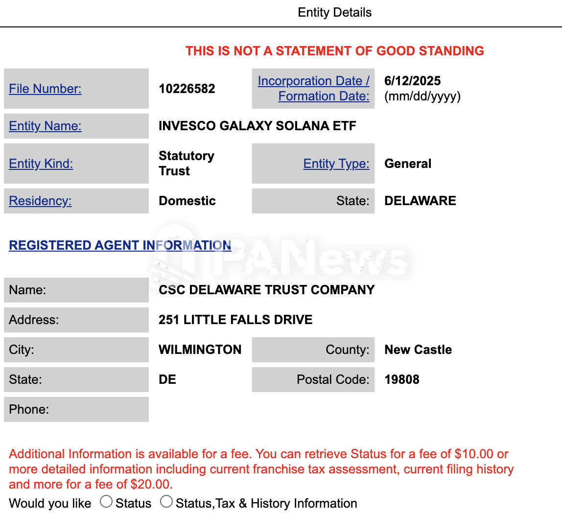 WEEX 唯客博客, PANews 6月13日消息,根據特拉華州公司註冊處信息,Invesco Galaxy Solana ETF已於2025年6月12日在特拉華州正式註冊設立,實體類型為法定信託(Statutory Trust),註冊地址為Wilmington市Little Falls Drive 251號,由CSC Delaware Trust Company擔任註冊代理人。 WEEX交易所官網:https://www.weex.com
